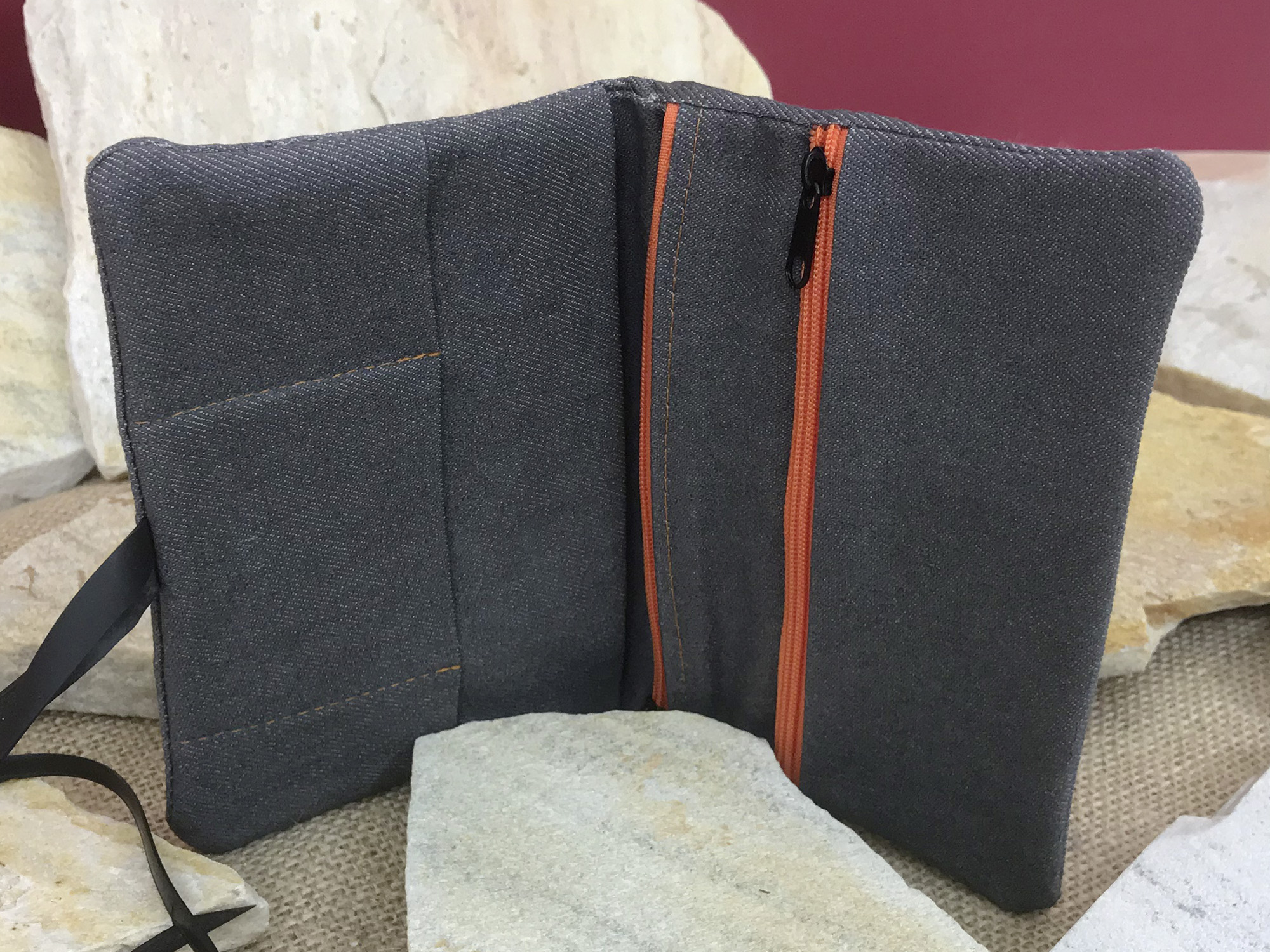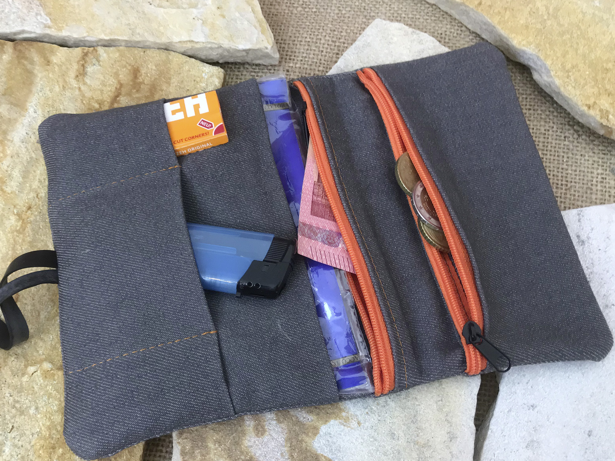 Diese einzigartige Tabaktasche wurde in liebevoller Handarbeit aus grauem Jeansstoff mit orangenen Nähten und Reißverschlüssen genäht.