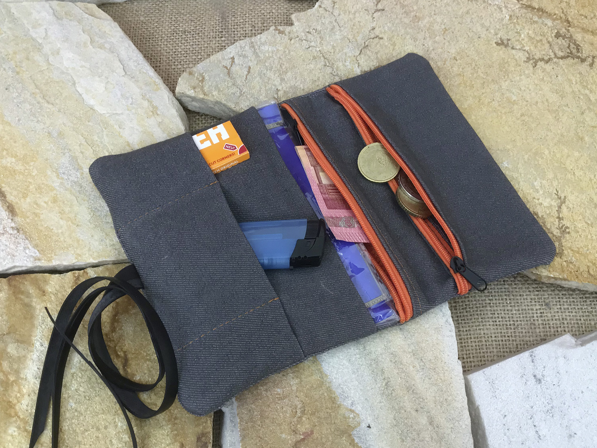 - zwei Taschen mit Reißverschluss für Geldscheine und Kleingeld sowie