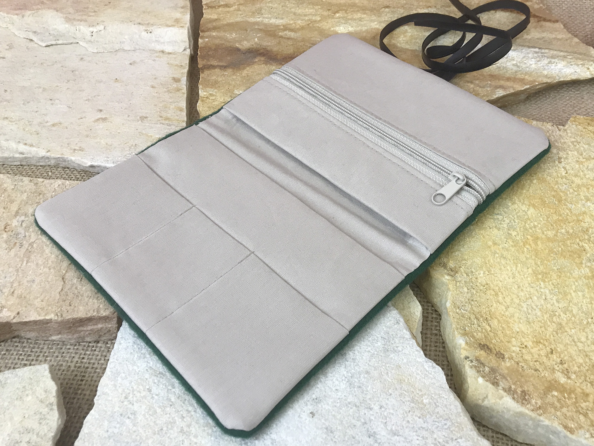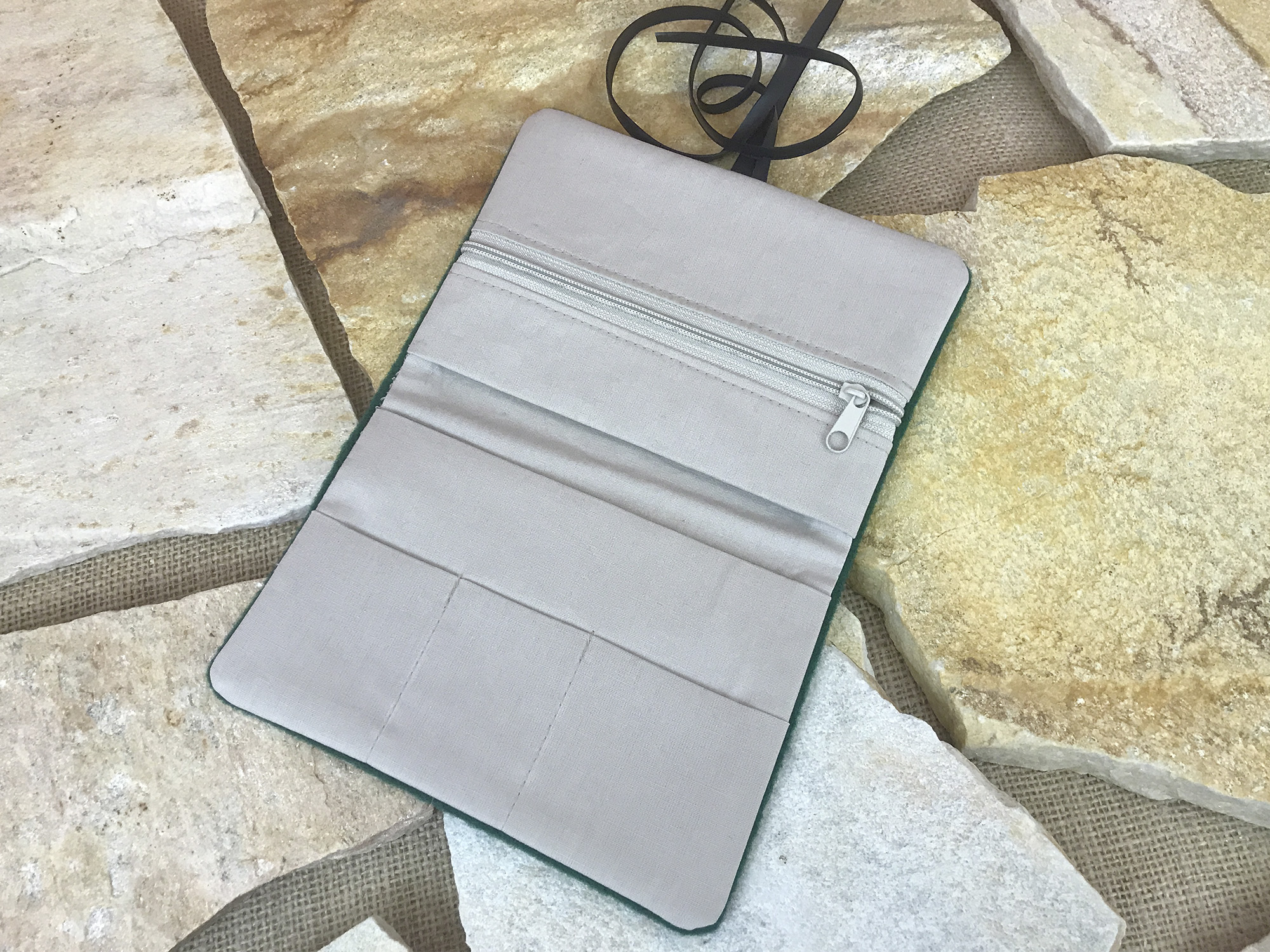 Die Tabaktasche hat 2 große Fächer für den Tabakbeutel, eine Reißverschlusstasche für Filter oder andere Utensilien und 3 kleinere Fächer für Feuerzeug, Blättchen etc. Verschlossen wird das Täschchen lose mit einer zarten Schnur aus aufbereitetem Fahrradschlauch. (Alternativ kannst Du die Tabaktasche auch mit einem schwarzen Gummiband erhalten. Einfach beim Bestellvorgang angeben.)